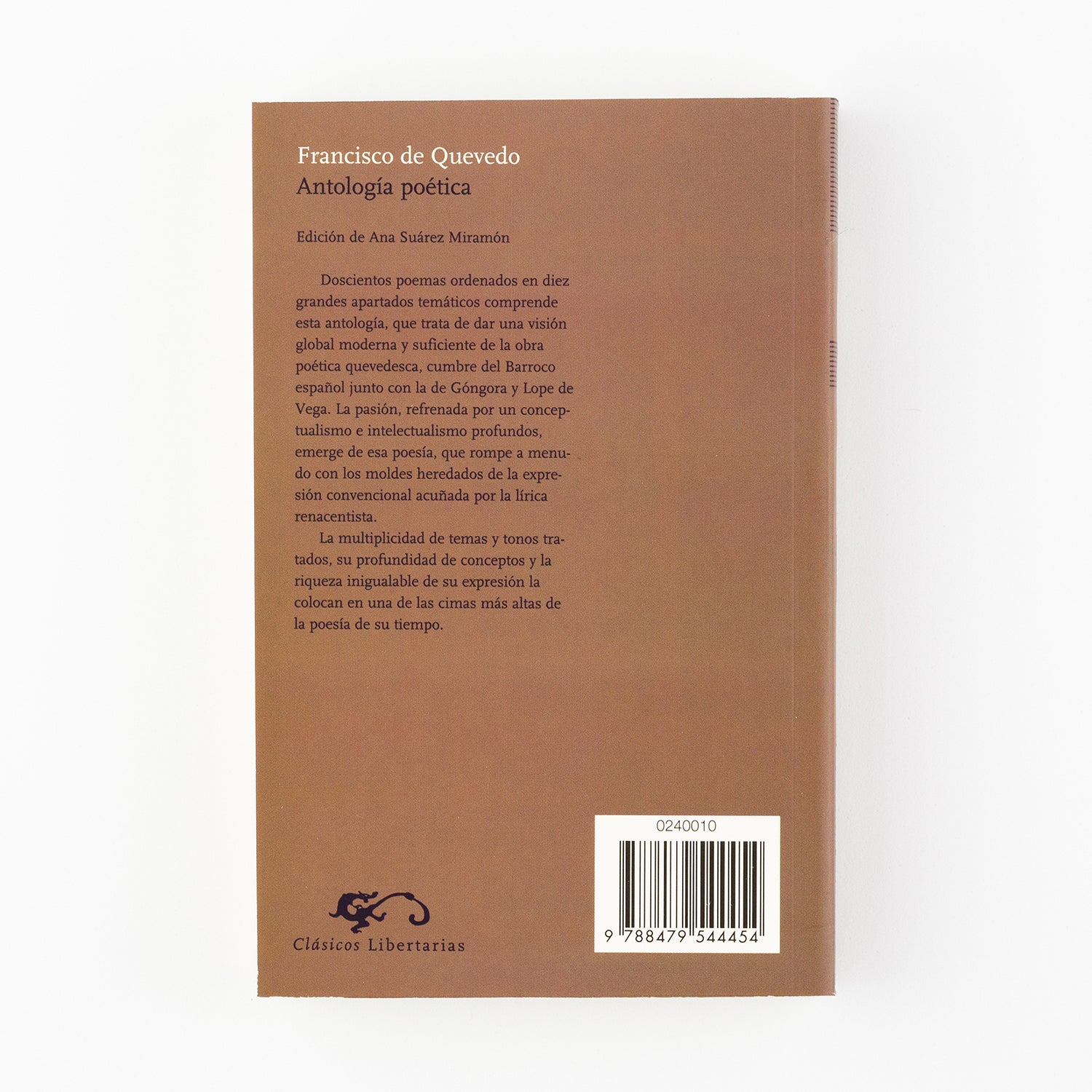 Doscientos poemas ordenados en diez grandes apartados temáticos comprende esta antología, que trata de dar una visión global moderna y suficiente de la obra poética quevedesca, cumbre del Barraco español junto con la de Góngora y Lope de Vega. La pasión, refrenada por un conceptualismo e intelectualismo profundos, emerge de esa poesía, que rompe a menudo con los moldes heredados de la expresión convencional acuñada por la lírica renacentista.