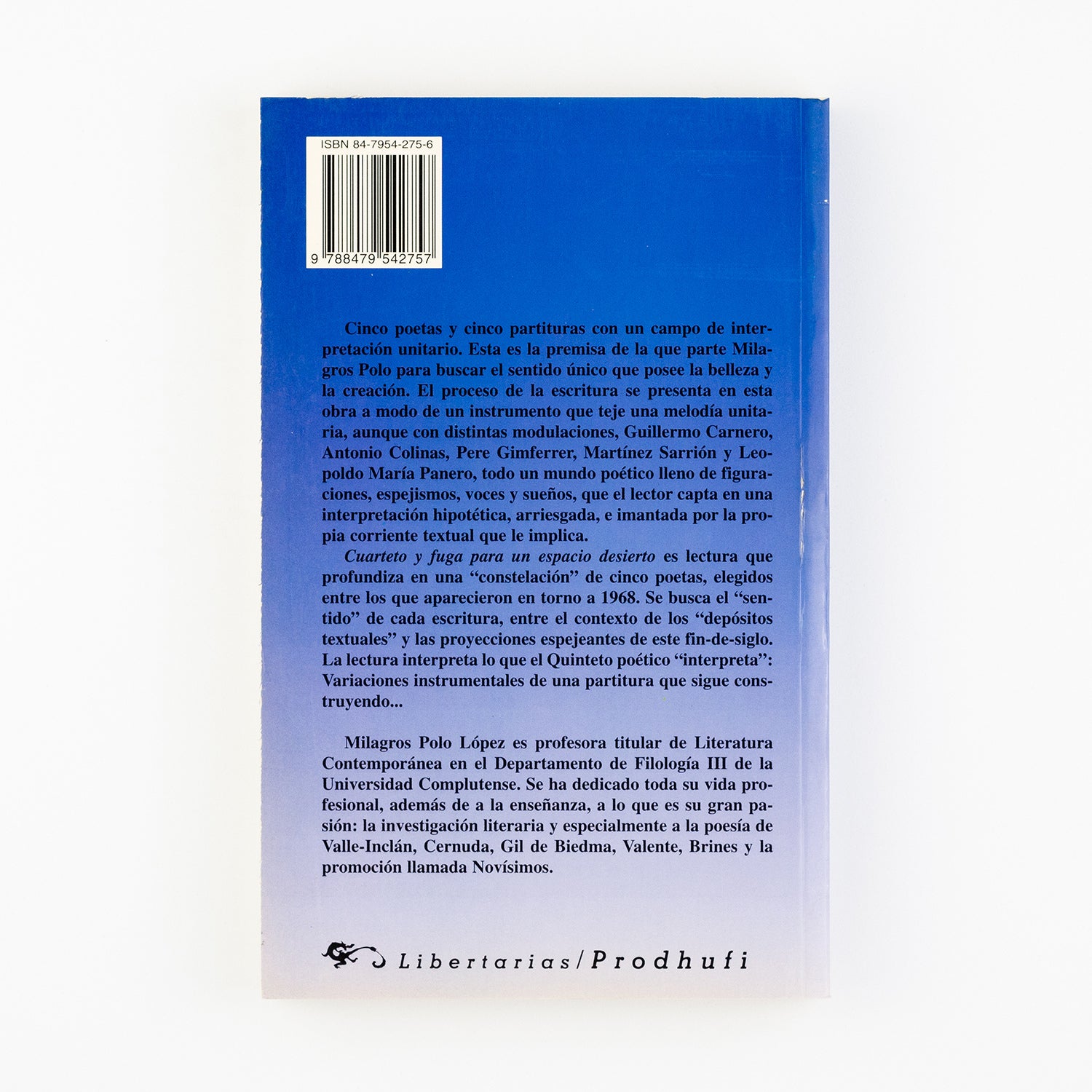 Cuarteto y fuga para un espacio desierto es lesctura que profundiza en una "constelación" de cinco poetas, elegidos entre los que aparecieron en torno a 1968. Se busca el "sentido" de cada escritura, entre el contexto de los "depósitos textuales" y las proyecciones espejeantes de este fin-de-siglo. La lectura interpreta lo que el Quinteto poético "interpreta": Variaciones instrumentales de una partitura que sigue construyendo...