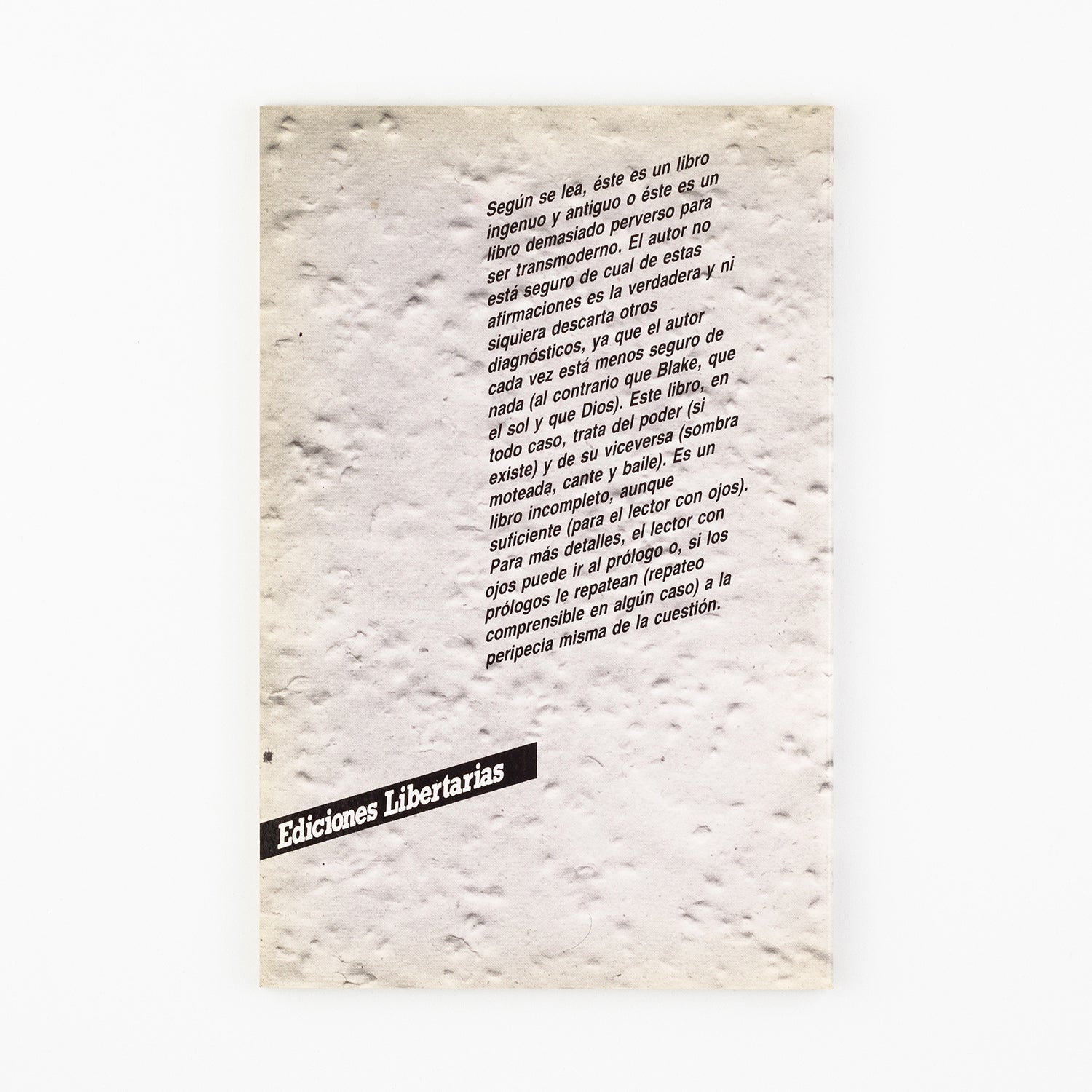 Según se lea, este es un libro ingénuo y antiguo o este es un libro demasiado perverso para ser transmoderno. El autor no está seguro de cual de estas afirmaciones es la verdadera y ni siquiera descarta otros diagnósticos, ya que el autor cada vez está menos seguro de nada (al contrario que Blake, que el que y que Dios). Este libro, en todo caso, trata del poder (si existe) y de su viceversa (sombra moteada, cante y baile). Es un libro incompleto, aunque suficiente (para el lector con ojos). Para más detalles, el lector con ojos puede ir al prólogo o, si los prólogos le repatean (repateo comprensible en algún caso) a la peripecia misma de la cuestión.