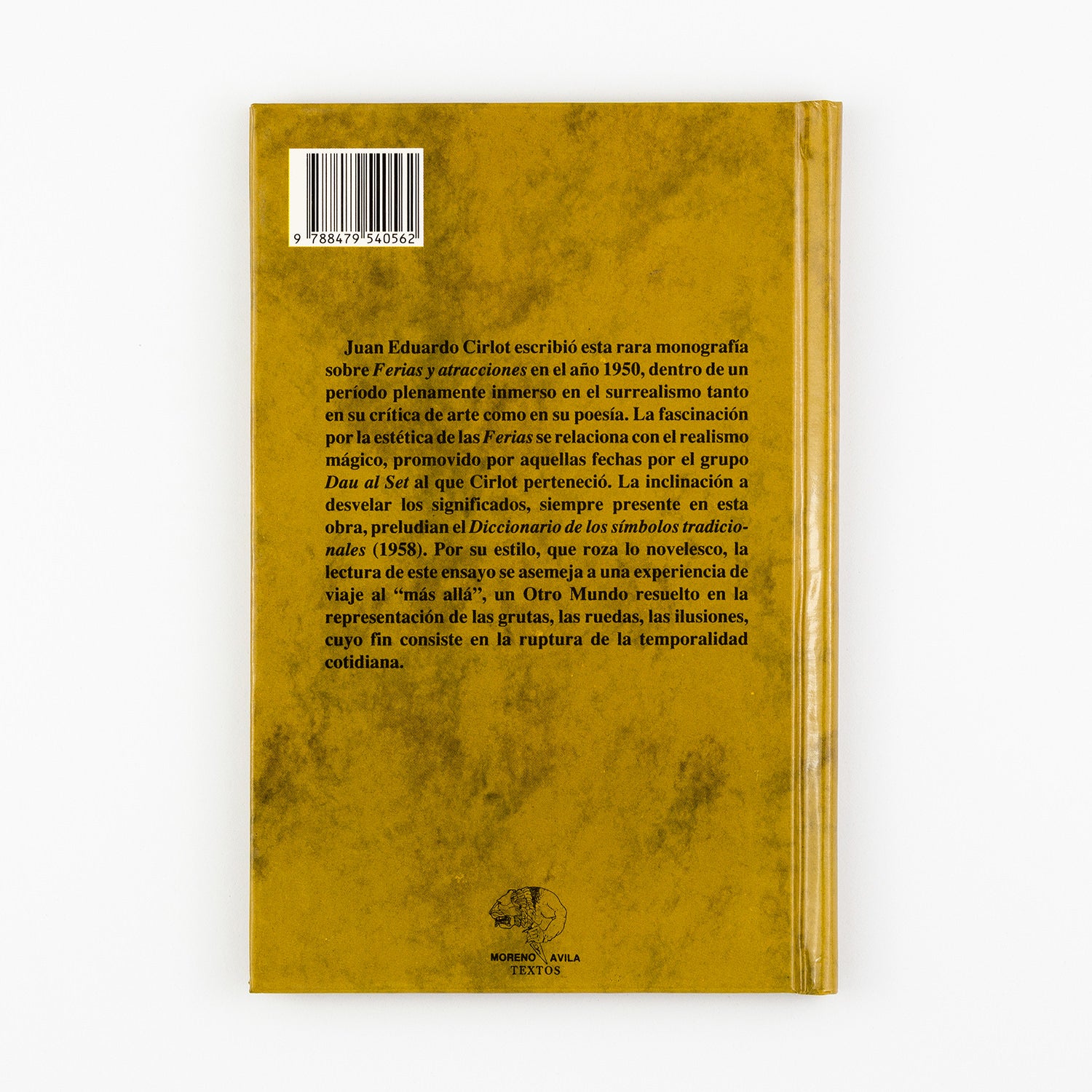 Juan Eduardo Cirlot escribió esta rara monografía sobre Ferias y atracciones en el año 1950, dentro de un período plenamente inmerso en el surrealismo tanto en su crítica de arte como en su poesía. La fascinación por la estética de las Ferias se relaciona con el realismo mágico, promovido por aquellas fechas por el grupo Dau al Set al que Cirlot perteneció. La inclinación a desvelar los significados, siempre presente en esta obra, preludian el Diccionario de los símbolos tradicionales (1958). Por su estilo, que roza lo novelesco, la lectura de este ensayo se asemeja a una experiencia de viaje al "mas alla", un Otro Mundo resuelto en la representación de las grutas, las ruedas, las ilusiones, cuyo fin consiste en la ruptura de la temporalidad cotidiana.