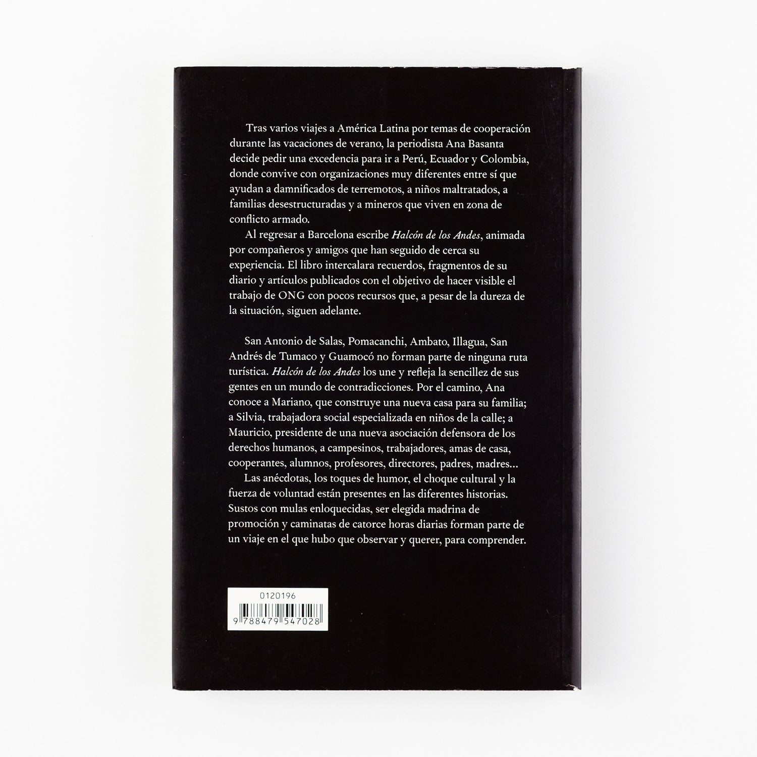 San Antonio de Salas, Pomacanchi, Ambato, Illagua, San Andrés de Tumaco y Guamocó no forman parte de ninguna ruta turística. Halcón de los Andes los une y refleja la sencillez de sus gentes en un mundo de contradicciones. Por el camino, Ana conoce a Mariano, que construye una nueva casa para su familia; a Silvia, trabajadora social especializada en niños de la calle; a Mauricio, presidente de una nueva asociación defensora de los derechos humanos, a campesinos, trabajadores, amas de casa, cooperantes, alumnos, profesores, directores, padres, madres...