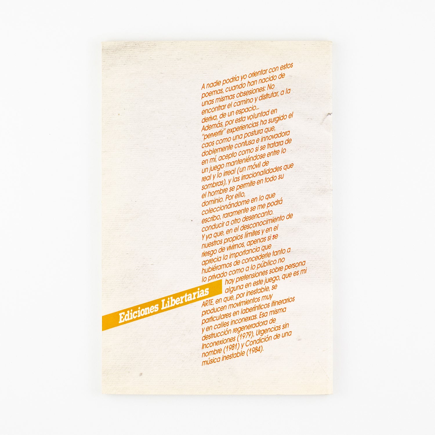 Además, por esta voluntad en "pervertir" experiencias ha surgido el caos como una postura que doblemente confusa e innovadora en mí, acepto como si se tratara de un juego manteniéndome entre lo real y lo irreal (un móvil de sombras), y las irracionalidades que el hombre se permite en todo su dominio. Por ello, coleccionandome en lo que escribo, raramente se me podrá conducir a otro desencanto. Y ya que en el desconocimiento de nuestros propios límites y en el riesgo de vivirnos, apenas si se aprecia la importancia que hubiéramos de concederle tanto a lo privado como a lo público no hay pretensiones sobre persona alguna en este juego, que es mi ARTE, en que, por inestable, se producen movimientos muy particulares en laberínticos itinerarios y en calles inconexas. Esa misma destrucción regeneradora de inconexiones (1979), Urgencias sin nombre (1981) y Condición de una música inestable (1984).