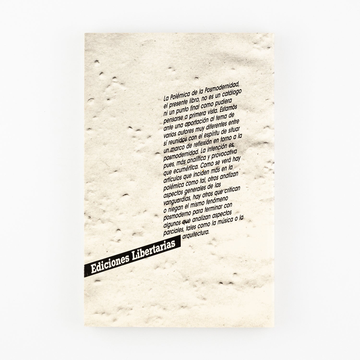 El presente libro no es un catálogo, ni un punto final como pudiera pensarse a primera vista. Estamos ante una aportación al tema de varios autores muy diferentes entre sí reunidos con el espíritu de situar un marco de reflexión en torno a la posmodernidad. La intención es pues, más analítica y provocativa que ecuménica. Como se verá hay artículos que inciden más en la polémica como tal, otros analizan aspectos generales de las vanguardias, hay otros que critican o niegan el mismo fenómeno posmoderno para terminar con algunos que analizan aspectos parciales, tales como la música o la arquitectura.