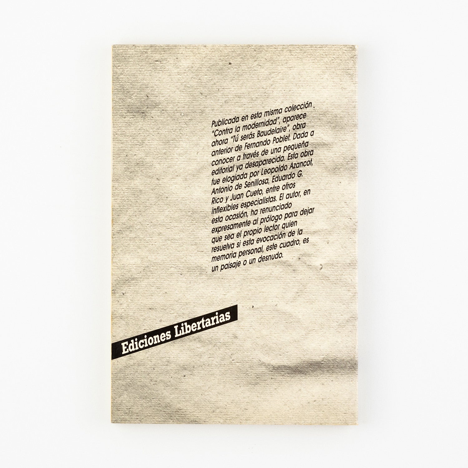 Publicada en esta misma colección Contra la modernidad, aparece ahora Tú serás Baudelaire, obra anterior de Fernando Poblet. Dada a conocer a través de una pequeña editorial ya desaparecida. Esta obra fue elogiada por Leopoldo Azancot, Antonio de Senillosa, Eduardo G. Rico y Juan Cueto, entre otros inflexibles especialistas.